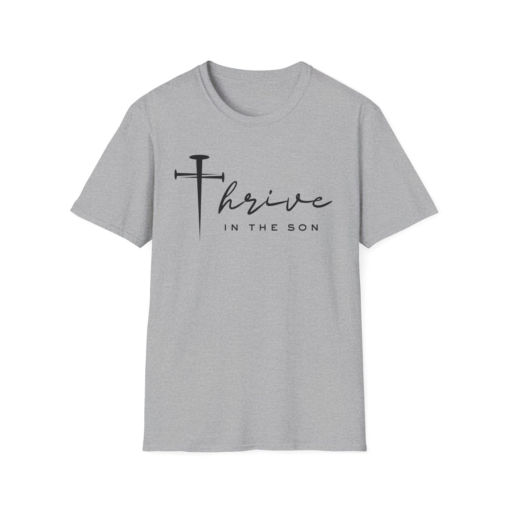 Soft, simple, and quietly uplifting — this lightweight tee carries a gentle message without shouting. A slim, handwritten script reads “thrive” beside a minimalist cross, with subtle “IN THE SON” text beneath. It settles easily into day-to-day life: layered under a cardigan during morning study groups, worn alone for a Sunday coffee run, or pulled on after choir rehearsal. The breathable ring-spun cotton feels smooth against skin and drapes cleanly thanks to the classic crew cut. The design’s restrained palette keeps the focus on faith and calm confidence, creating a shirt that becomes a comfortable reminder more than an outfit statement.